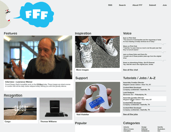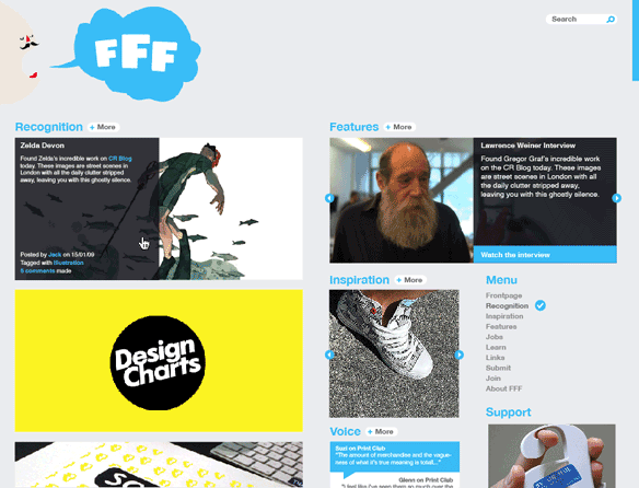 FormFiftyFive launched 31st January 2007 and was originally a way for Jack Daly and myself to keep track of all the amazing work we kept sending each other via email. We wanted a way to archive all the work and links so that it would be easier to find when needed. Bit by bit our audience grew and we had a few people ask if they could join in. We tried really hard to post at least one decent link a day and it was getting more and more difficult, so it seemed to make sense to spread the wait a bit.