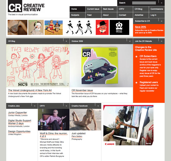 In many ways the CR Job was different to most of our projects, but not so because it meant working for one of the de-facto mouthpieces of our own industry, but because the parameters were different — in many ways more commercial then Bureau is used to. As any other Magazine, CR’s income is generated largely by advertising — so the site had to be effective about the way it enables advertisin to work alongside the content. This is in stark contrast to most of our clients who are based in the cultural sector, where advertising plays little or no role at all.