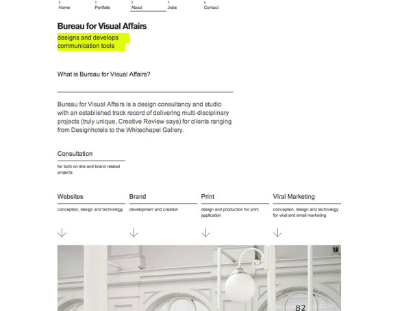 Hmmm — we think of the design of websites in particular in very pragmatic, almost utilitarian terms, which I think is at the heart of what you refer to. The thinking is less about style but about ways to communicate often large and changeable content which needs to be accommodated both in a visual but also in a technological way. This flexibility and modularity in the design to change with the client’s demands or circumstance is key to what we think separates our work from that of others — and this is crucially as much a technology decisionmaking process as it is a design one. In addition many of or clients are based in the cultural sector so have very strict guidelines in terms if accessiblity, which of course also influences design decisions.